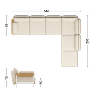 The Mio corner sofa as a 5-seater with chaise longue offers generous space for six to eight people. The spacious chaise longue invites you to lie down and makes the sofa the centerpiece of your living room. You can choose between solid oak armrests with metal connectors or upholstered armrests with oak legs. The sofa can also be mirrored or assembled in a different configuration.