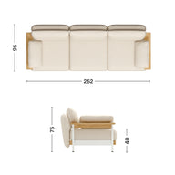 The sofa offers generous space for three to four people. Choose between elegant solid oak armrests or softly upholstered armrests – combined with white metal legs or oak legs. For extra cosiness, you can optionally add two matching arm cushions.