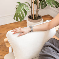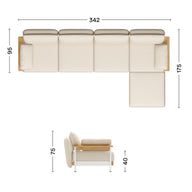 The 4-seater with chaise longue offers generous space for family and friends. Choose between elegant solid oak armrests or softly upholstered ones combined with oak legs. For even more comfort, you can optionally add two matching arm cushions. The sofa can also be mirrored during assembly.